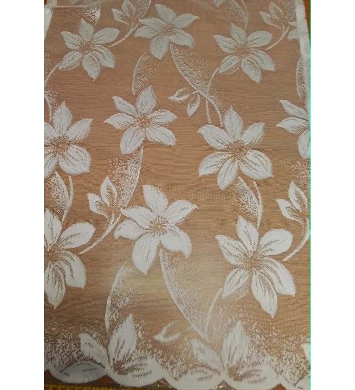 Fehér alapon,tele virágos,nem gyűrődős fényáteresztő függöny.Alja hullámos,levél csokrokkal díszített.Mintás vagy akár egyszínű sötétítő vagy dekor függöny is egyaránt illik hozzá!Választhatjuk nappaliba,háló vagy vendég szobába.Közepesen áttetsző,lágy esésű anyag,mosása,vasalása közepes fokon ajánlott!