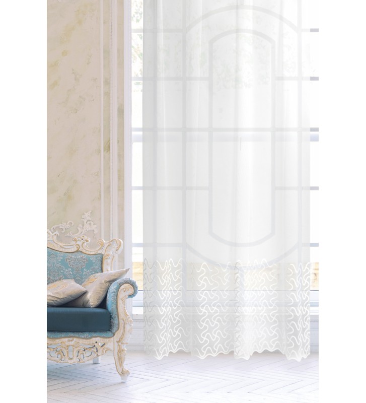 Ekrü alapon,alul hullám mintás nem gyűrődős alapanyagú modern fényáteresztő függöny.Az alja hullámos,az anyag tulajdonsága hogy mosás után nem feltétlen igényel vasalást.A helyére nedvesen visszaakasztva kilógja magát és gyűrődés mentesen szárad.Mintája az aljától mérve 100 cm magasságig ér.