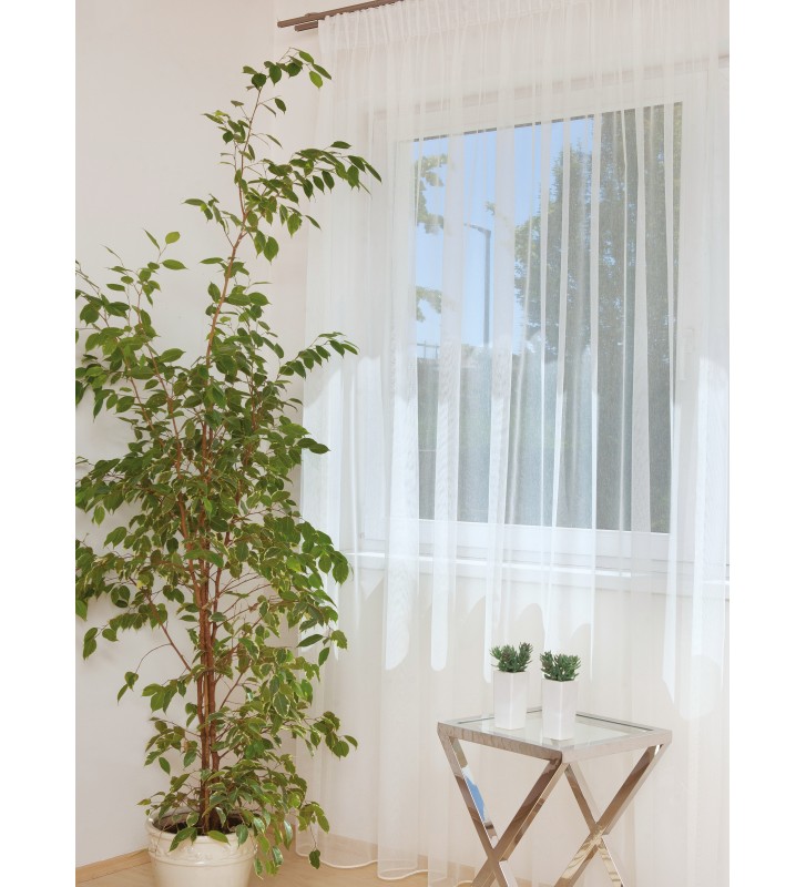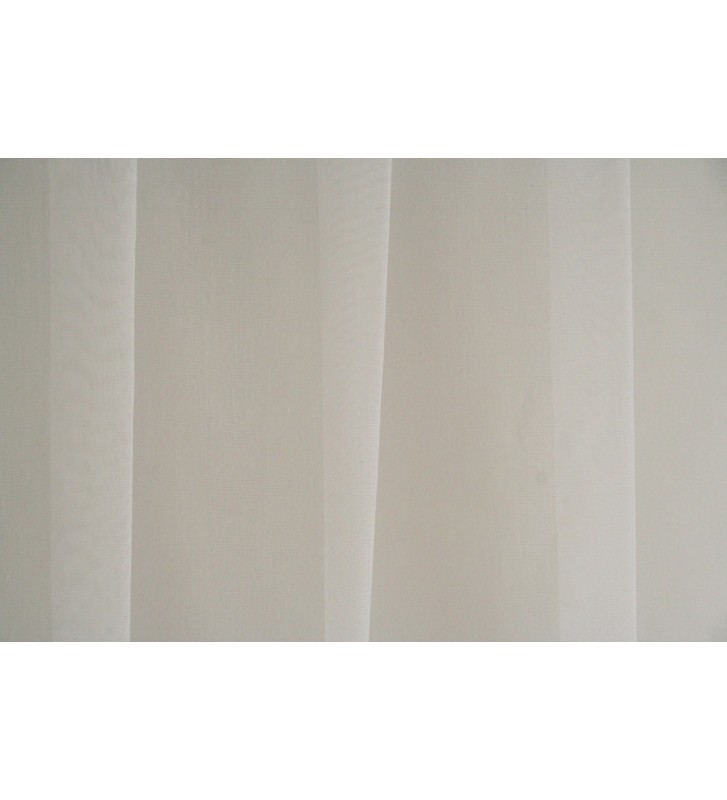 Egyszínű fehér,fényáteresztő függöny.A fényt jól átereszti,szolid megjelenése minden stílushoz jól illeszkedik.Alján gyárilag ólomzsinórral szegve.