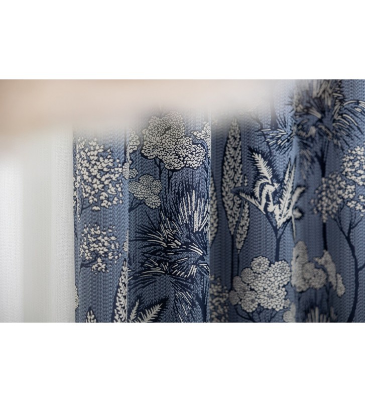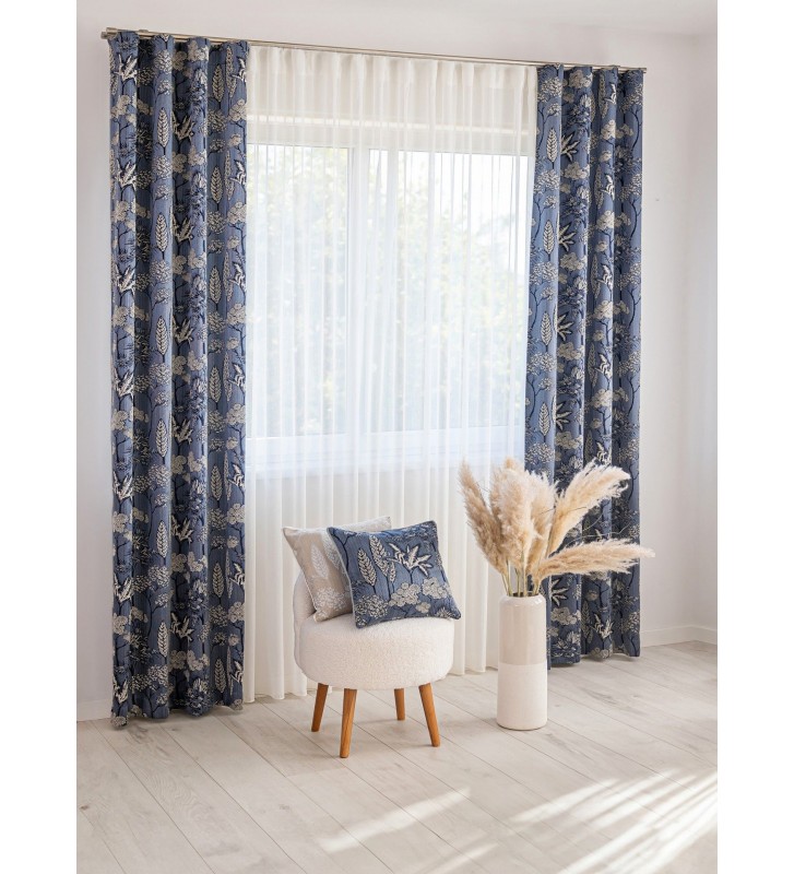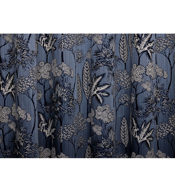 Anyagában fényes,növény mintás,elegáns modern függöny.Kék és bézs színek dominálnak benne.Közepesen vastag,lágy esésü sötétítö függöny.Egyszínű minta nélküli fényáteresztő függönyt javaslunk hozzá.Tökéletes választás a nappaliba vagy étkezőbe drapéria vagy sötétítő függönynek.