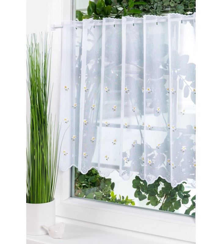 Fehér alapon,hímzett margaréta virágokkal díszített vitrázs függöny. Apró sárga virágokkal elhozza a természet kivirágzásának hangulatát,ezzel árasztva jó kedvet és romantikus szépséget a konyhába vagy étkezőbe.