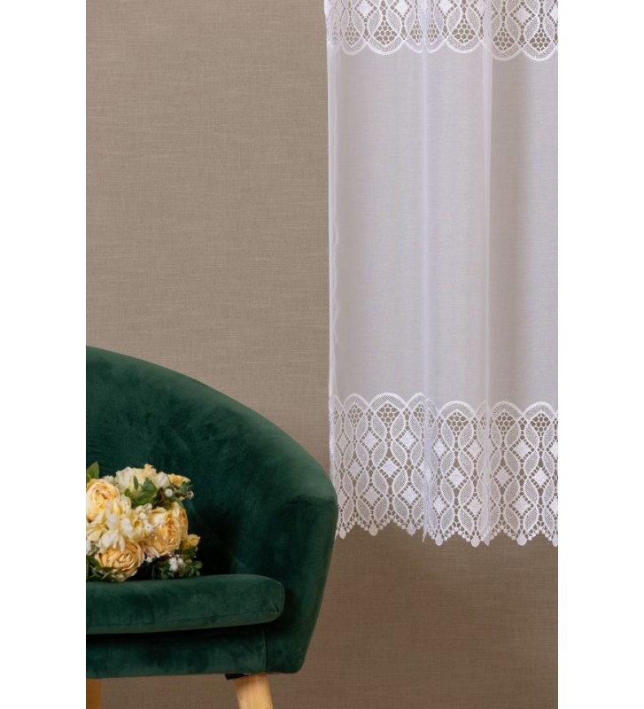 Fehér alapon,bordűrös,applikált mintás fényáteresztő függöny.Alja hímzett cikk-cakk mintás.Klasszikus mintája retro stílust idéz.Egyszínű vagy hasonló hullám mintájú sötétítő vagy dekor függöny javasolt hozzá!Választhatjuk nappaliba,háló vagy gyerek szobába.Közepesen áttetsző,lágy esésű anyag,mosása,vasalása közepes fokon ajánlott!