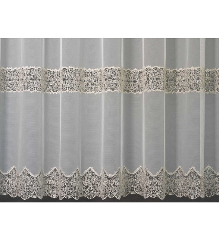 Ekrü alapon vajszínű bordűrös,hímzett,mintás fényáteresztő tüll függöny.Klasszikus stílusú hímzett,csillogó függöny,az alja hullámos,hímzett.Közepesen áttetsző,lágy esésű anyag,mosása,vasalása közepes fokon ajánlott!Egyszínű sötétítő vagy dekor függöny javasolt hozzá.Nappaliba,hálószobába ajánljuk.