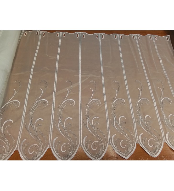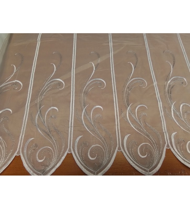 Fehér voile alapon, alján hímzett szürke indamintás bordűrös vitrázs függöny.Sávosan hímzett,ismétlődő minta.Nappaliba,étkezőbe is tehetjük szolid mintája miatt.