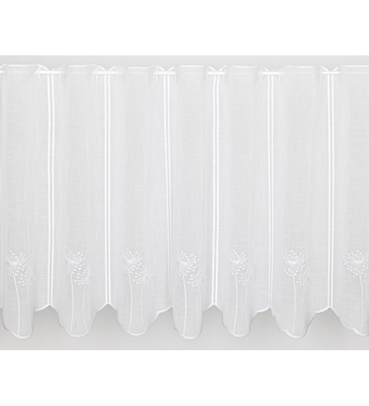 Fehér szablé alapon,pitypang mintás hímzéssel szőtt szolid vitrázs függöny.Kisebb ablakokra javasoljuk akár konyhai,de lehet szobai vagy előszoba függönye is.Hímzett lyuksorának köszönhetően könnyen felhelyezhető egy vitrázsrúd segítségével.