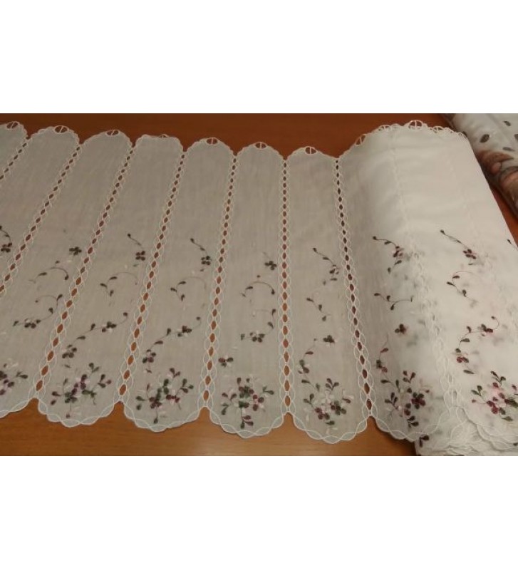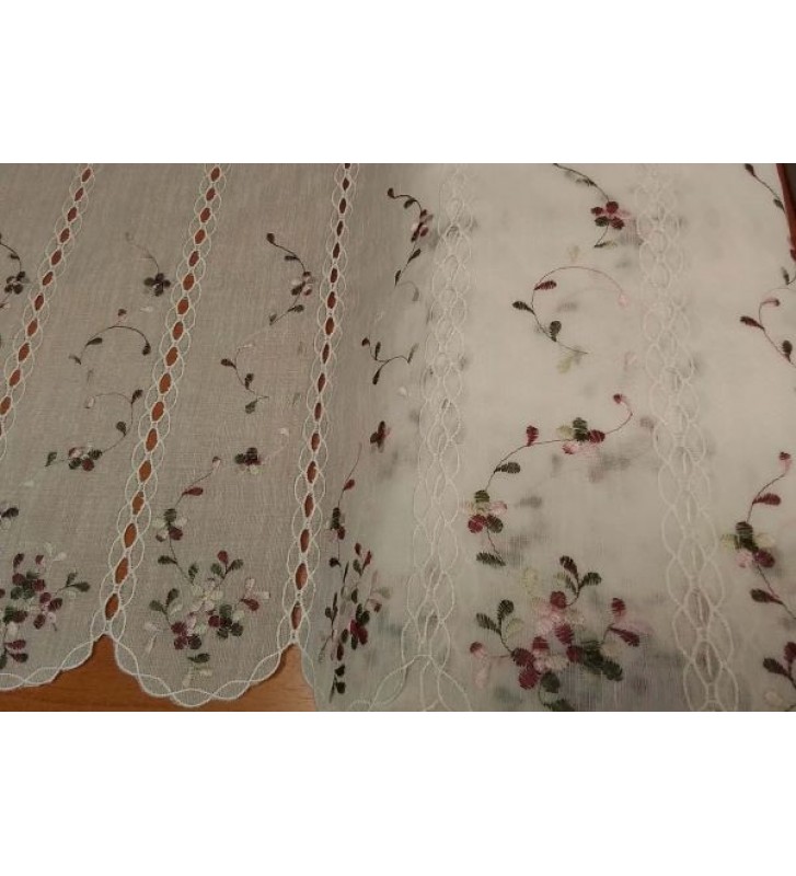 Fehér szablé alapon,színes hímzett futó virág mintájú vitrázs függöny.Sávosan hímzett színes inda mintás.Nappaliba,étkezőbe egyaránt feltehető vidám függöny.