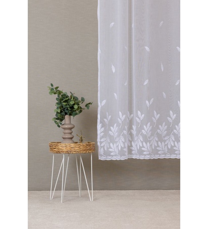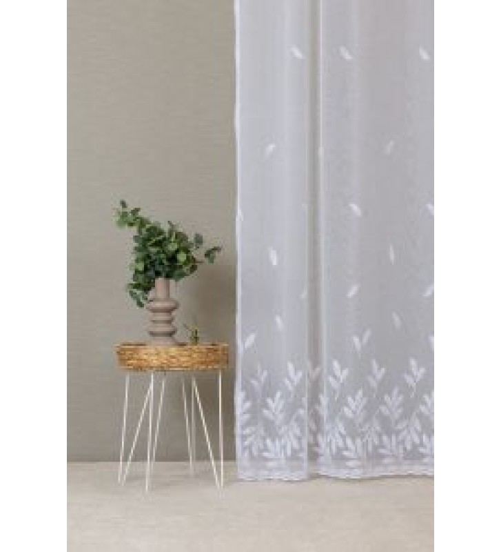 Szablé alapú hímzett levélke mintájú,modern fényáteresztő függöny.Áttetsző,lágy esésű anyag.Kímélő mosás javasolt,vasalást nem igényel,könnyen kezelhető. Hasonló mintájú vagy egyszínű sötétítő vagy dekor illik hozzá.